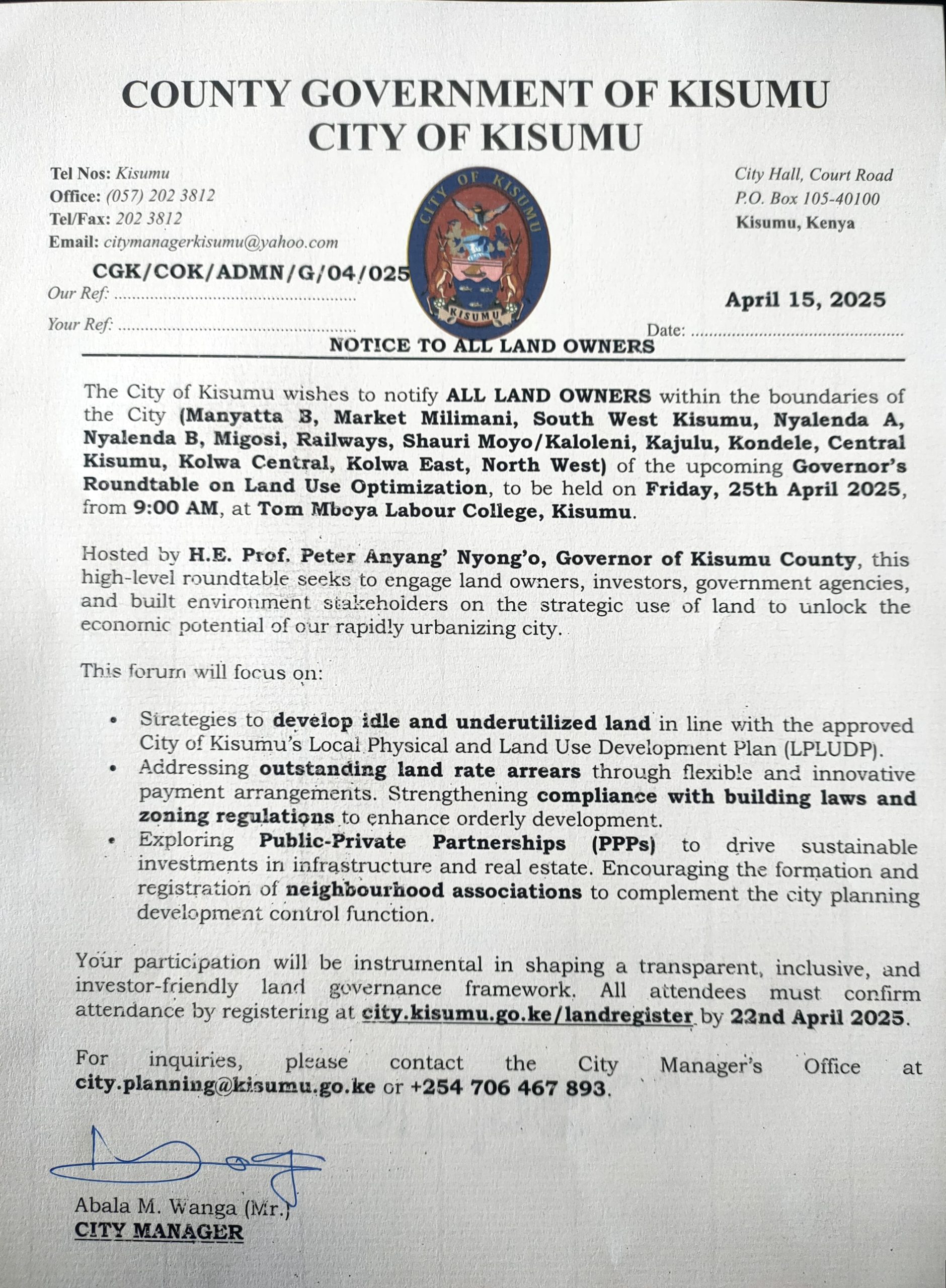 Apr162025Events Category: EventsApril 16, 2025Leave a comment Share This Article Share on FacebookShare on Facebook Share on XShare on X Pin itShare on Pinterest Share on LinkedInShare on LinkedIn Author: Administrator https://city.kisumu.go.ke Post navigationPreviousPrevious post:A NEW ERA OF LEADERSHIP BEGINSNextNext post:KISUMU GOVERNOR’S LANDS AND INVESTMENTS ROUNDTABLERelated postsCITY MARKS MAZINGIRA DAY WITH CLARION CALL FOR MORE EFFORT IN TREE PLANTINGOctober 10, 2025KISUMU SHINES IN COLOURFUL TOURISM WEEK 2025 CELEBRATIONSSeptember 29, 2025LAUNCH OF THE CHUN JEONG-EUN-NYONG’O CANCER CENTRESeptember 13, 2025ESTABLISHMENT OF THE ASCA-RSVC HUB IN KISUMUSeptember 12, 2025ASCA SUMMIT IN KISUMU USHERS IN A NEW ERA FOR SMART CITIES IN AFRICASeptember 11, 2025NOTICE TO ALL LAND OWNERS & STAKEHOLDERSMay 7, 2025