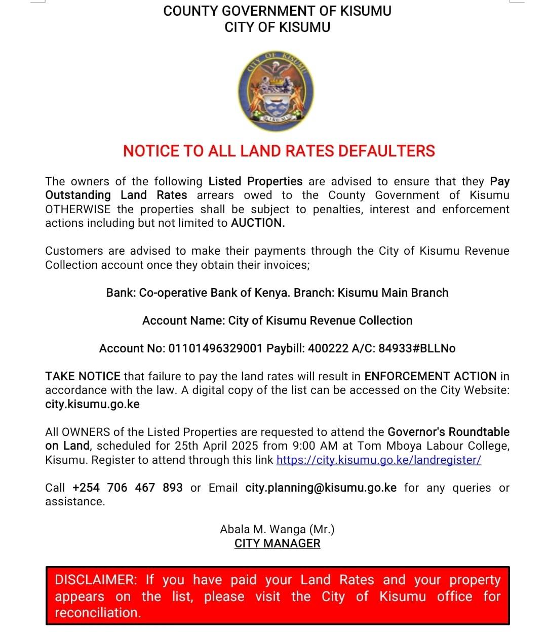 All land rates defaulters are hereby advised to settle their outstanding arrears with the County Government of Kisumu without delay. Failure to do so will result in the imposition of penalties, interest, and enforcement actions, which may include but not limited to auctioning.