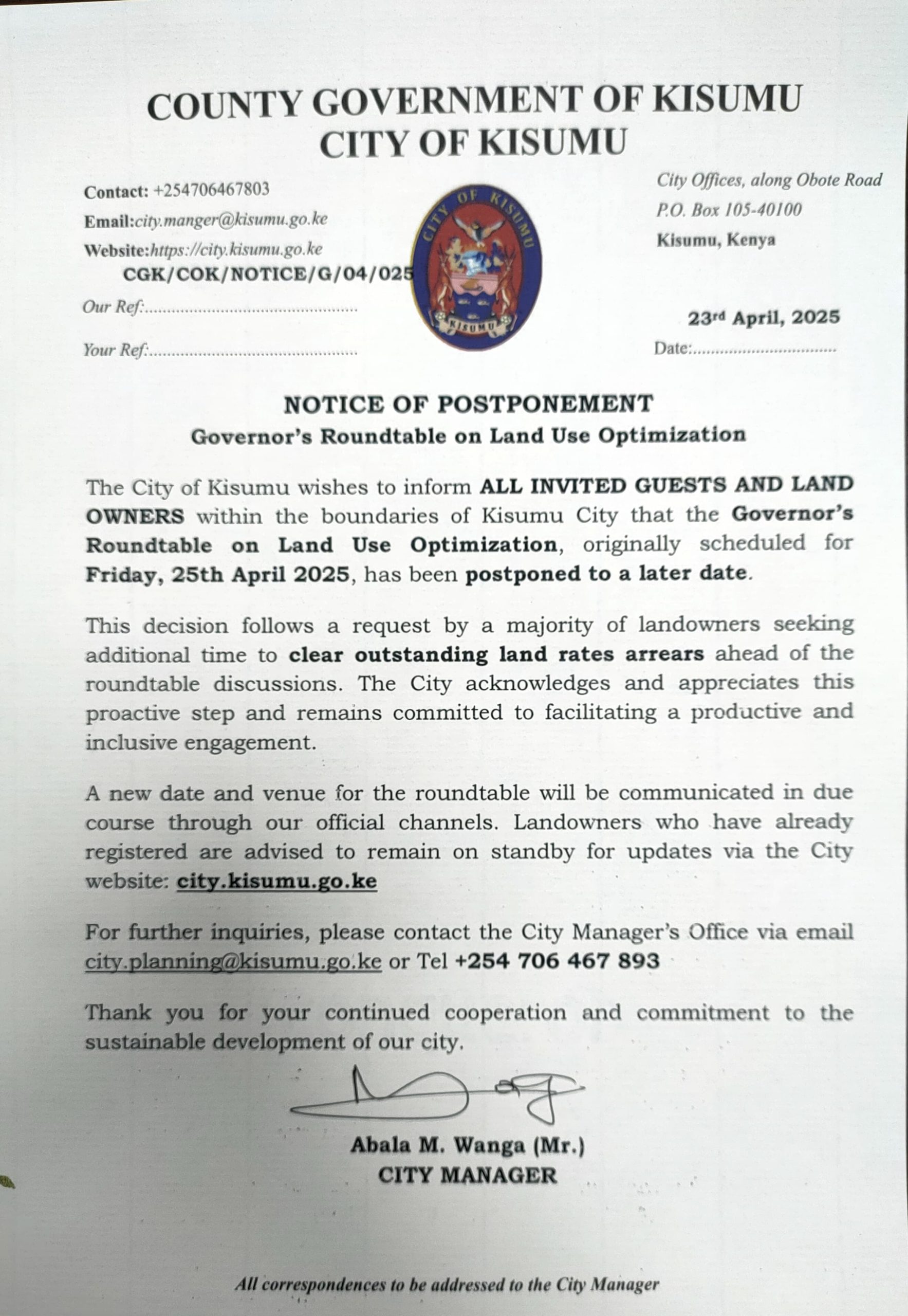 Apr232025News ItemCategory: News ItemApril 23, 2025Leave a comment Share This Article Share on FacebookShare on Facebook Share on XShare on X Pin itShare on Pinterest Share on LinkedInShare on LinkedIn Author: Administrator https://city.kisumu.go.ke Post navigationPreviousPrevious post:NOTICE TO ALL LANDRATES DEFAULTERSNextNext post:BUILDING BRIDGES: Strengthening Kisumu-China Partnerships for Economic Growth and job CreationsRelated postsKISUMU CITY CONTINUES TO STRATEGISE ON WAYS OF ENHANCING REVENUE COLLECTIONNovember 21, 2025KISUMU CITY SIGNS MOU WITH GERMAN TOWN TO BOOST DISASTER PREPAREDNESSNovember 6, 2025KISUMU COUNTY UNVEILS BOLD REVENUE OPTIMIZATION STRATEGY AT MASENO ATCNovember 5, 2025CITY PARTNERS WITH ‘BETTER FOR WATER’ TO BOOST CLEAN WATER ACCESS AND FIRE SAFETY IN INFORMAL SETTLEMENTSNovember 3, 2025NYONG’O MEETS CHINESE DELEGATION ON GROWTH OPPORTUNITIESOctober 28, 2025KISUMU STRENGTHENS TIES WITH CHINA YIYANG CITY IN DRIVE FOR SUSTAINABLE URBAN GROWTHOctober 28, 2025