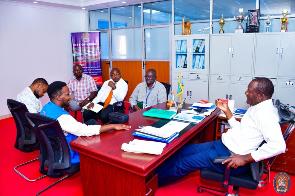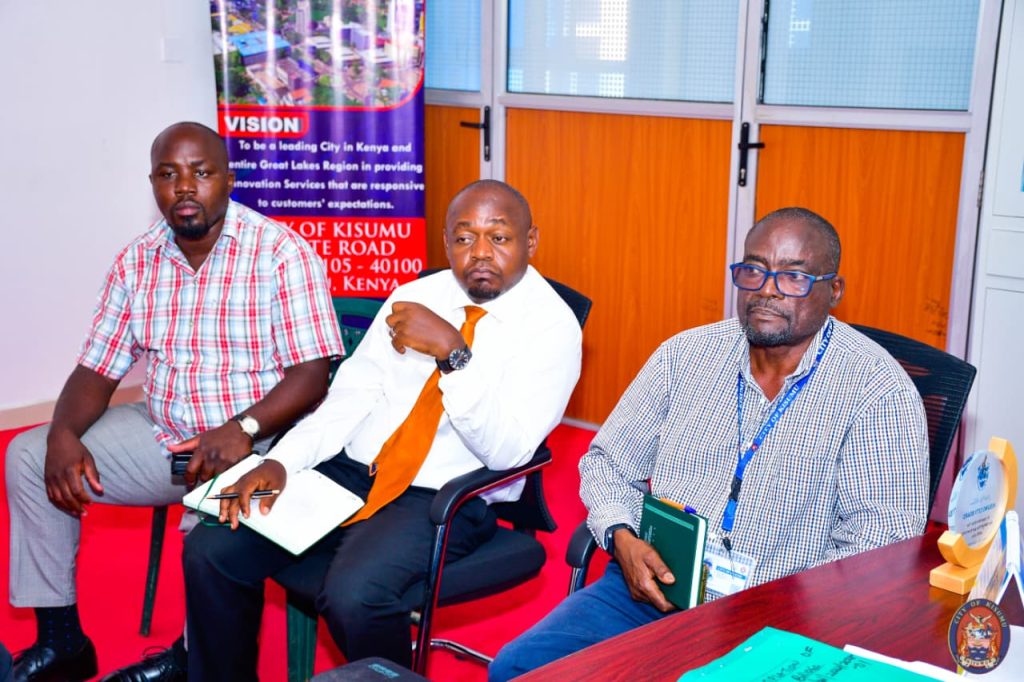 Earlier this morning, a high-level meeting was held between UNDP representatives and the Kisumu City leadership to review implementation progress and align strategic priorities. The meeting was attended by City Manager Abala Wanga, UNDP DRR and Resilience Project Officer Raphael Kimani Mutitu, Head of ICT Ayim OBA, Deputy Head of ICT Michael Obare, City Head of Engineering Wilson Omondi, and Director of Communication and Corporate Affairs Aaron Ochieng.